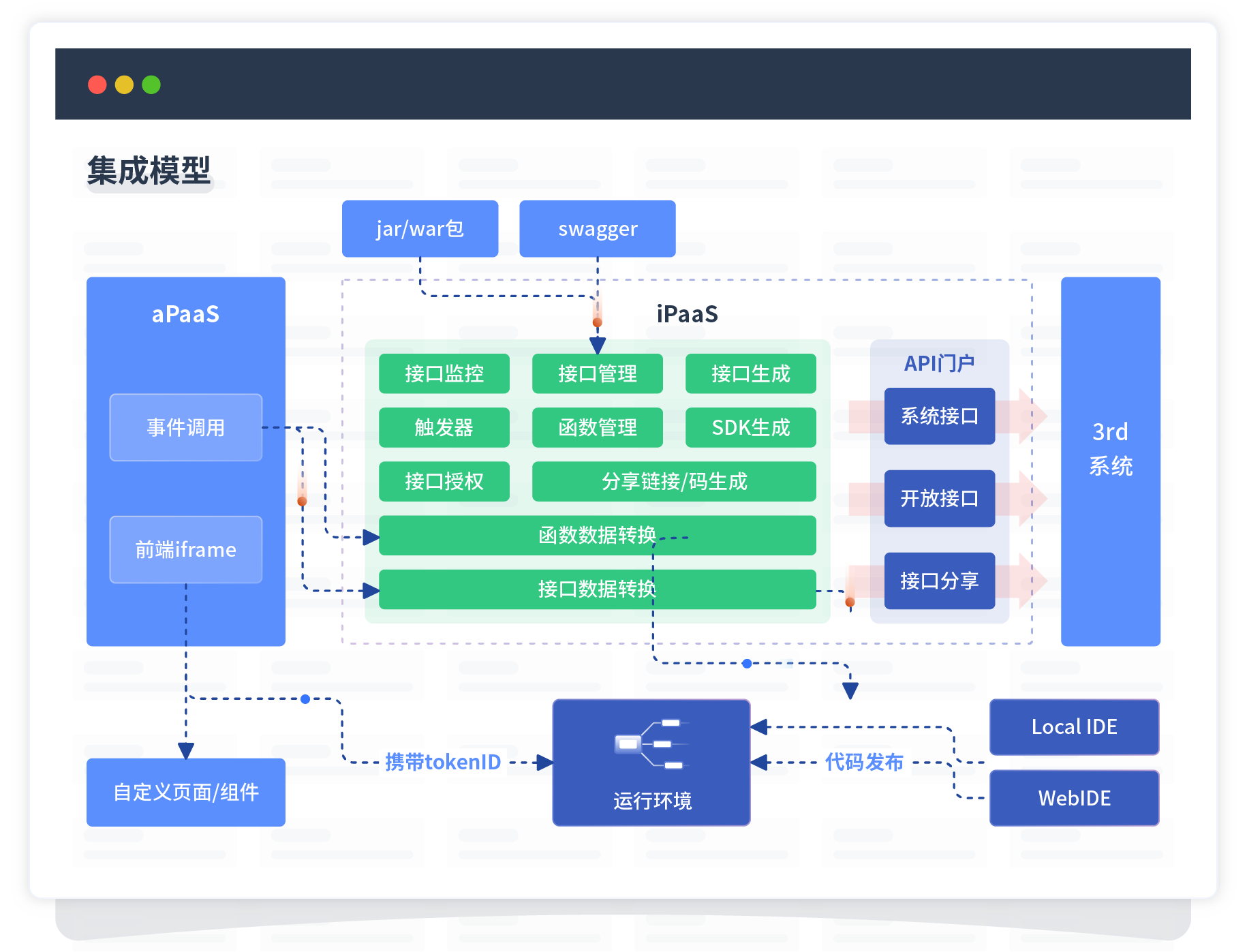 集成模型包括平台本身前、、、、后端能力的扩展,,,也支持通过API门户和第三方系统进行交互。。。