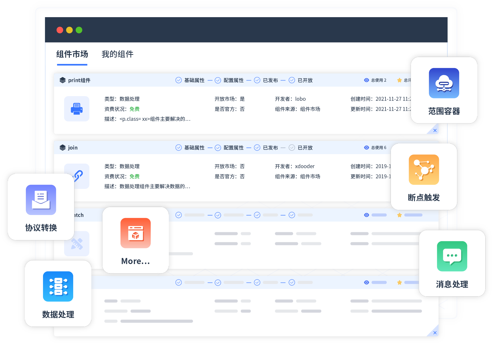 针对集成场景,,,,GOPAY钱包提供组件市场,,例如协议转换、、消息处理、、文件操作等。。。除平台提供的组件外,,,客户可以自定义所需组件。。。