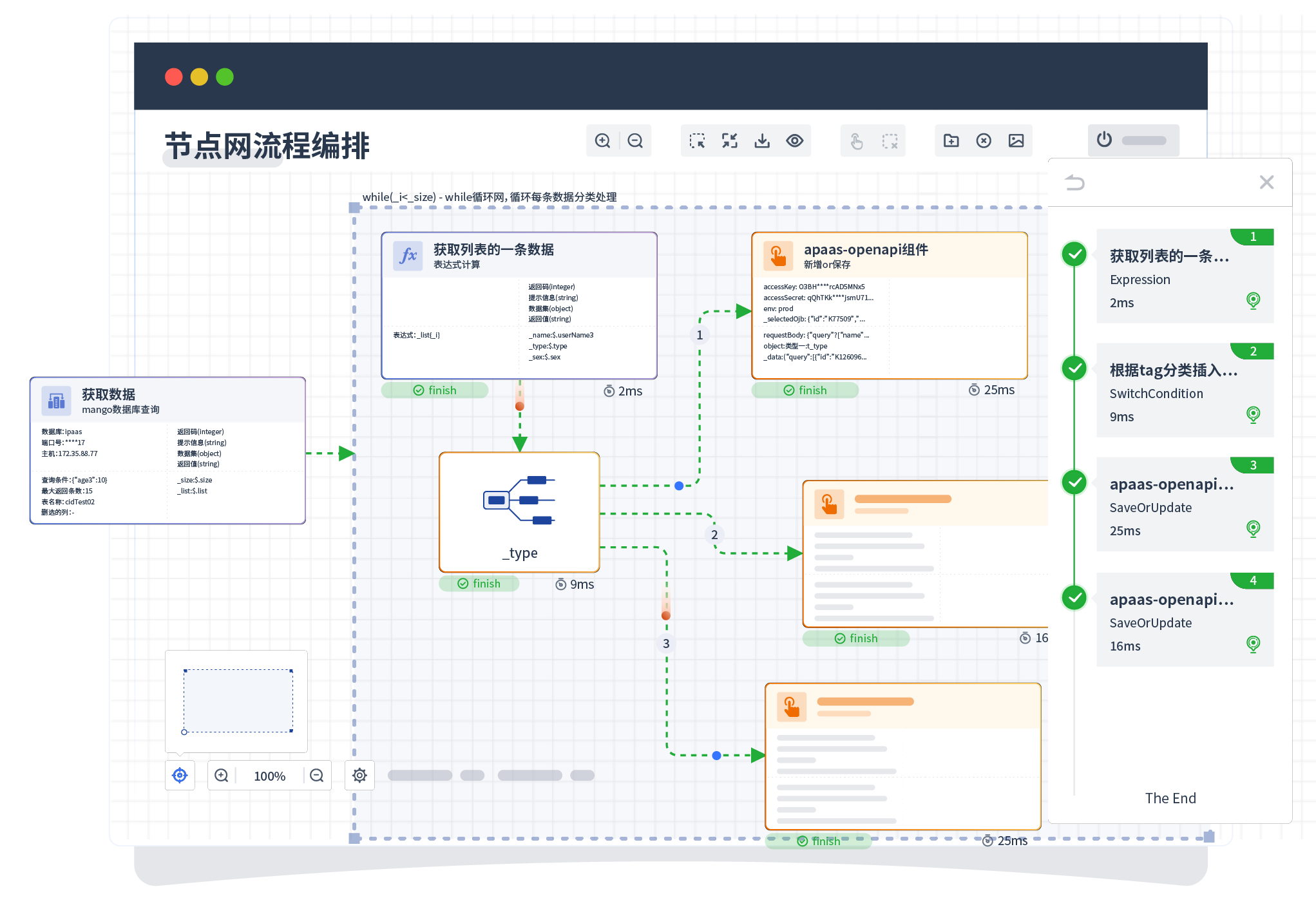 针对集成场景,,组件定义后支持进行流程编制,,,,不同于传统代码方式,,通过图形化展示,,,,支持在线调试、、、、日志查看和运行回放。。。