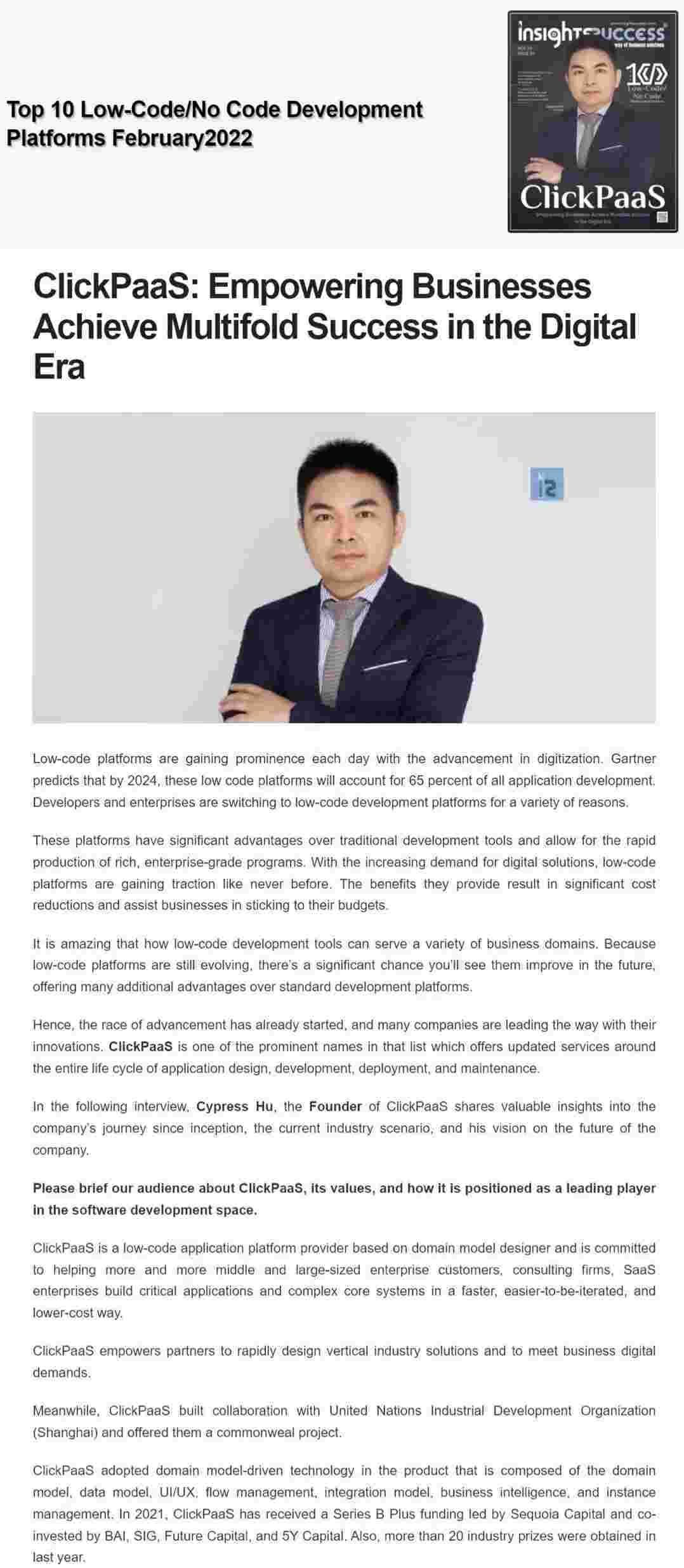 2022年年初,,GOPAY钱包入选外媒Insights Success低代码/无代码开发平台 Top10,,,,创始人、、CEO胡柏受邀接受专访并荣登封面人物,,,,他与Insights Success的读者分享了GOPAY钱包成立的初心、、发展历程、、当前的行业发展趋势以及他对公司未来的展望。。。